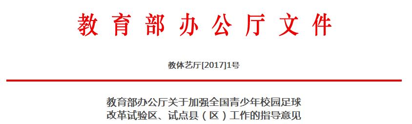 为贯彻《国务院办公厅关于印发〈中国足球改革发展总体方案〉的通知》(国办发〔2015〕11号)精神,落实《教育部等6部门关于加快发展青少年校园足球的实施意见》(教体艺〔2015〕6号)、《全国校园足球特色学校基本标准(试行)》要求,加快改革步伐,积累典型经验,示范和带动全国校园足球整体发展,教育部先后遴选确立了青岛市、厦门市、延边朝鲜族自治州等校园足球改革实验区及北京市延庆区等全国青少年校园足球试点县(区)。在现有工作的基础上,将继续开展校园足球改革实验区和试点县(区)的遴选工作。为推动和指导改革实验区、试点县(区)工作,现提出以下指导意见: