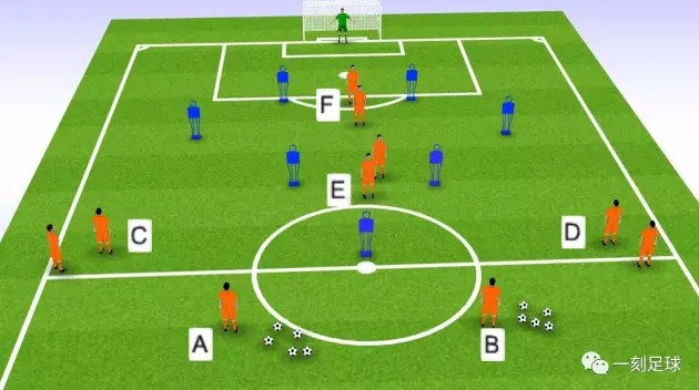1.训练先从右侧开始,球员A传球给球员E。