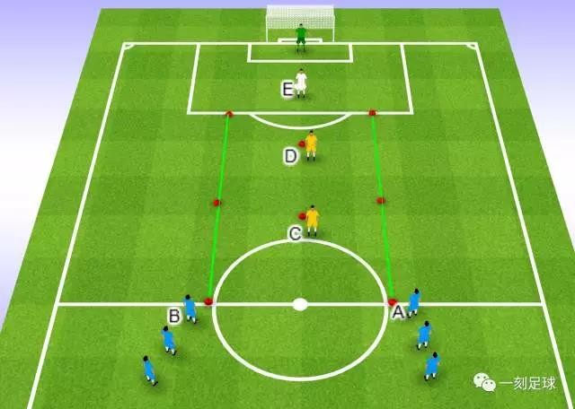 2.四名球员(一名守门员,一名防守球员E、以及中场接应球员C和球员D),其余球员分为两组站在A和B两处。