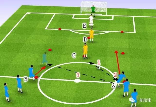 1.球员A拿到球后,保持对球的控制,直塞球给B,由B直接射门,或者与左路高速插上的球员B做二过一配合,过掉防守队员E,再直接面对球门。